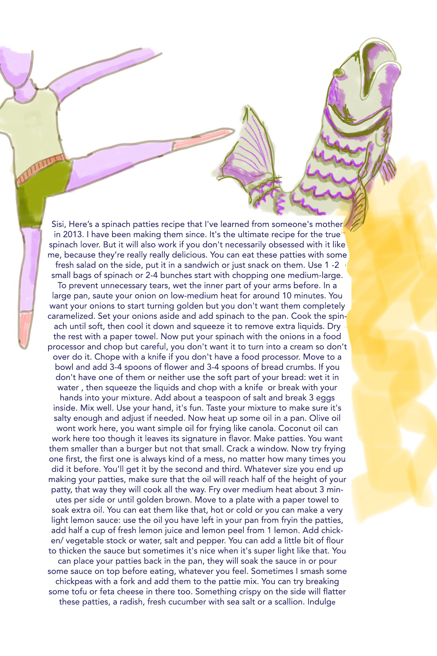 A collection of letters with a recipe and digital drawing,